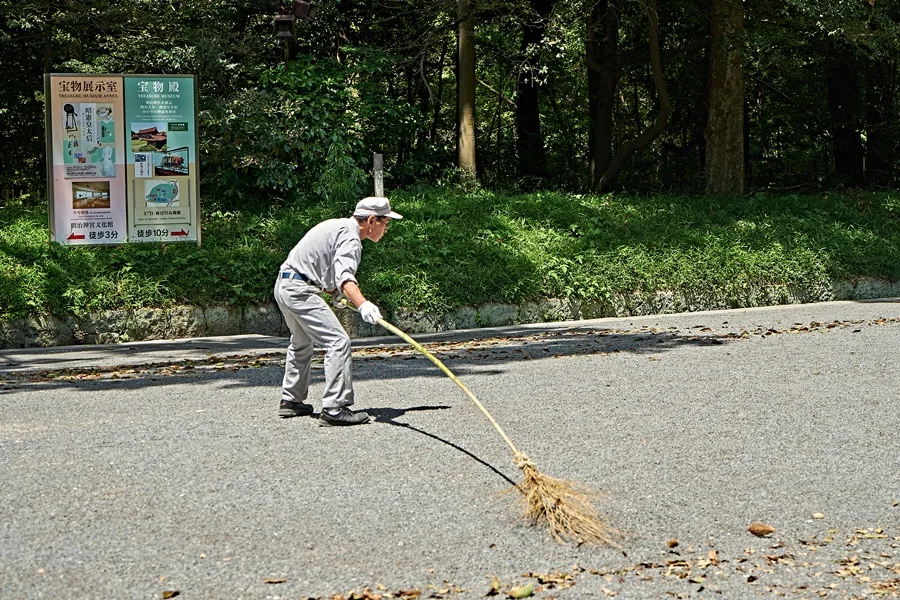 This person (temple ground sweeper) is no exception to such Japanese artisan culture. Using -perhaps the longest broom stick I've ever encountered in my travels, circles are drawn as he sweeps the ground. His choreographed motions and calm looks -even at visitors' attention and applause, demonstrate the serene skill (for sure) polished and derived for generations.